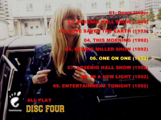 01. Down Under Contains Australian TV Special Featuring Tracks Are.. Tutta La Vita / Click Go The Shears / Walk Through Fire / Old Fashioned Man / Let's Talk About Tomorrow / Winter Angel / Get Out / Big & Strong / Love & Let Live / Australia For Me / The Rumour ARSENIO HALL SHOW (1989)